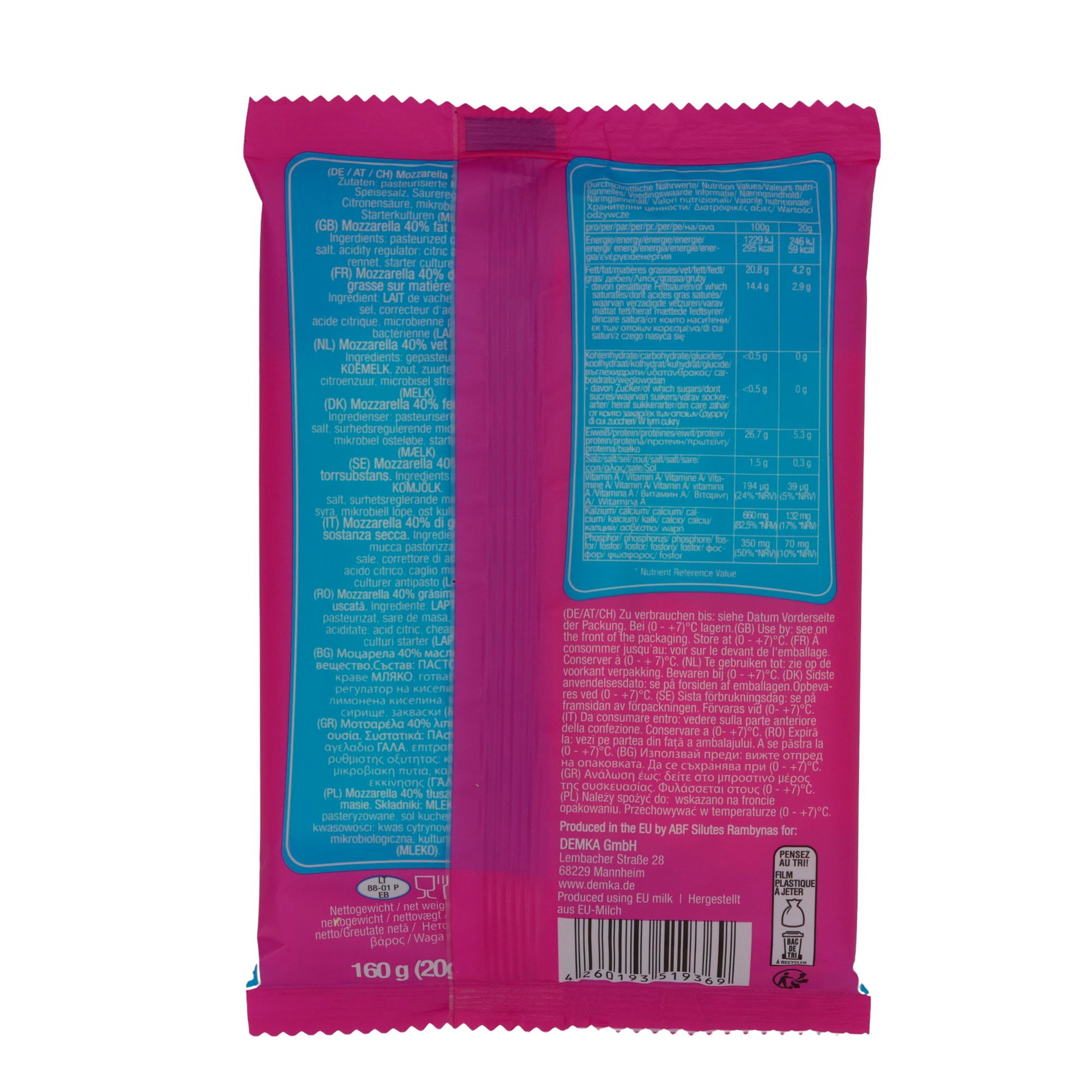 - Mozzarella 40 Prozent Fett i. Tr. (pasteurisierte Kuhmilch, Speisesalz, mikrobielles Lab, Milchsäurebakterien)